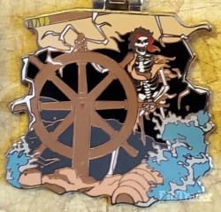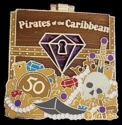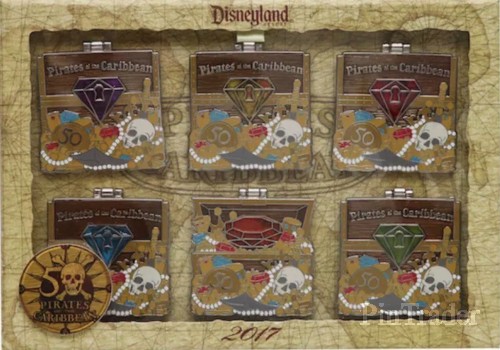 | Five of the pins in this set were also sold separately and have larger edition sizes. The completer pin in the set has an orange gem and an open treasure chest on the front. |