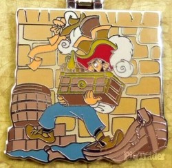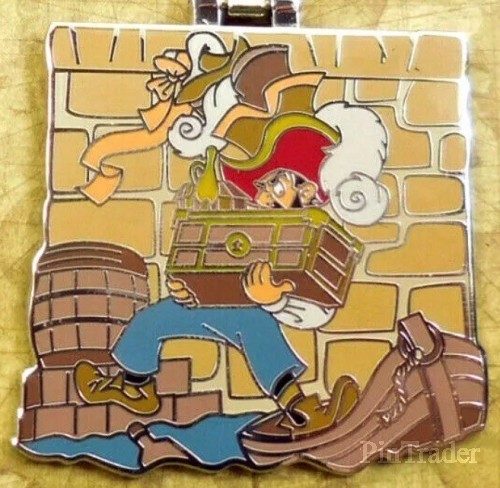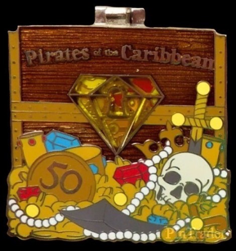 | Five of the pins in this set were also sold separately and have larger edition sizes. The completer pin in the set has an orange gem and an open treasure chest on the front. |