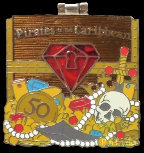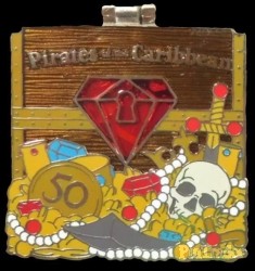 | Five of the pins in this set were also sold separately and have larger edition sizes. The completer pin in the set has an orange gem and an open treasure chest on the front. |