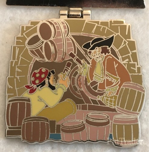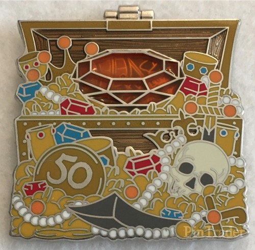 | Five of the pins in this set were also sold separately and have larger edition sizes. The completer pin in the set has an orange gem and an open treasure chest on the front. |