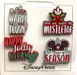 | Our famouse Mickey icon highlights four familiar ''season's greetings'' messages for this collectible cloisonné pin set. Magic in the details • Created especially for Walt Disney World Resort and Disneyland Resort • Set of four holiday text message pins Includes ''The Magic of the Season,'' ''All Warm and Fuzzy,'' ''Meet Me Under the Mistletoe,'' and ''Happy, Jolly, Merry'' • Enameled cloisonne • Silvertone finish • Mickey icon pinback • Part of our Nordic Winter Collection The bare necessities • Metal / enamel • “All Warm and Fuzzy'': 1 1/4'' H x 3/4'' W • Meet Me Under the Mistletoe'': 1 1/4'' H x 1 1/3'' W • ''Happy, Jolly, Merry'': 1 1/5'' H x 1 1/2'' W • ''The Magic of the Season'': 1 1/5'' H x 1 1/4'' W • Imported |