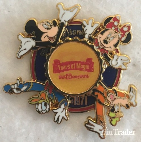 | This pin features Mickey Mouse, Minnie, Goofy, and Donald Duck as a spinner element. In front of the characters is a lenticular element that has the Walt Disney World retro logo and the iconic retro D with the Mickey icon in the middle. Behind the characters is a blue circle with a red border. At the bottom of the blue circle is Est. 1971. Similar to Pin #81768. Pin #81768 has a 4 and the Mickey head icon in the D on the lenticular element. Pin #90789 has just the Mickey head icon in the D on the lenticular element. |