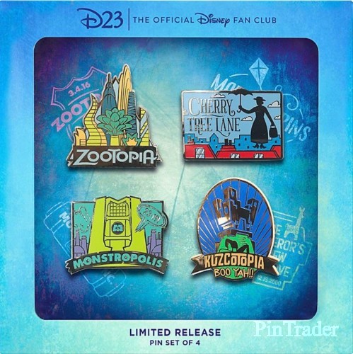 | Celebrate the fantastic worlds of Disney – both real and imagined – with this set of four pins depicting favorite Disney destinations. Created exclusively for D23 by artist Alex Riegert-Waters, these collector's keepsakes are inspired by vintage travel logos. Magic in the details * Created exclusively for D23 Gold and Gold Family Members * Limited Release * Boxed set of four pins * Includes Cherry Tree Lane, Zootopia, Zuzcotopia, and Monstropolis * Inspired by Mary Poppins, Zootopia, The Emperor's New Groove, and Monsters, Inc. * Designed by Alex Riegert-Waters * Enameled cloisonné * Each pin features a unique finish, from silver and gold to nickel * Mickey icon pinbacks * Official D23 stamp featured on backside of each pin * Comes in exclusive decorative box with display window * Exclusive to D23 Gold and Gold Family Members The bare necessities * Metal / enamel * Each pin approximately 2'' Diameter * Imported |