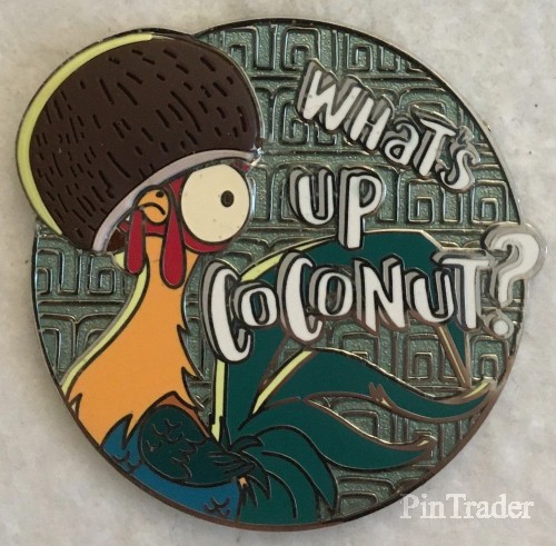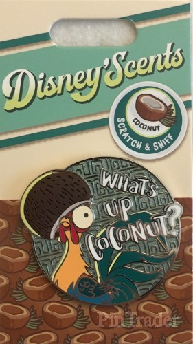| ''What's up coconut?'' Moana's pet rooster Hei Hei is crowned by a coconut shell for this limited edition Pin of the Month in the ''Disney Scents'' series. Magic in the details * Limited Edition of 2,000 * Collectible Pin of the Month * Features Hei Hei from Disney Moana * ''What's up coconut?'' text * Enameled cloisonné * Low relief background with translucent fill * Antique copper finish * Mickey icon pin backs * Disney Pin Trading 2020 backstamp * Comes on card with coconut scented spot * Part of the Disney Scents Pin Collection The bare necessities * Metal / enamel * Pin approx. 1 3/4'' H and W * Imported |