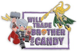 | Both Thor and Loki are thinking the same thing this Halloween: ''Will trade brother for candy.'' Treat yourself to this Marvel collectible cloisonné pin. Magic in the details * Collectible Marvel pin * Includes Thor and Loki * ''Will trade brother for candy'' text * Enameled cloisonné * Nickel finish * Mickey icon pin back * Disney Pin Trading 2020 backstamp * Disney Parks Halloween 2020 Collection The bare necessities * Metal / enamel * 1 3/4'' W * Imported |