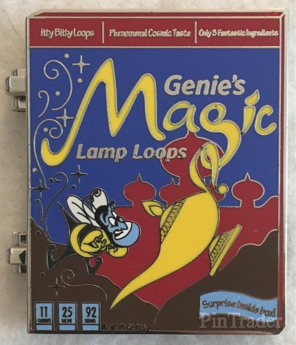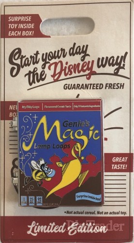 | Make a wish for our Genie's Magic Lamp Loops Cereal Box, materializing as a Limited Edition Pin-of-the-Month, a part of your complete breakfast collection. It's magically fictitious! Magic in the details * Limited Edition of 4,000 * Features Genie from Disney's Aladdin * ''Genie's Magic Lamp Loops'' cereal box pin * Hinged pin opens to reveal cereal art * Dangling scarab on chain * Enameled cloisonné * Nickel finish * Mickey icon pin backs * Disney Pin Trading 2020 backstamp * Comes on Card * Pin-of-the-Month in our Disney Parks Cereal Boxes Series The bare necessities * Metal / enamel * Pin approx. 2'' H * Imported |