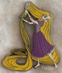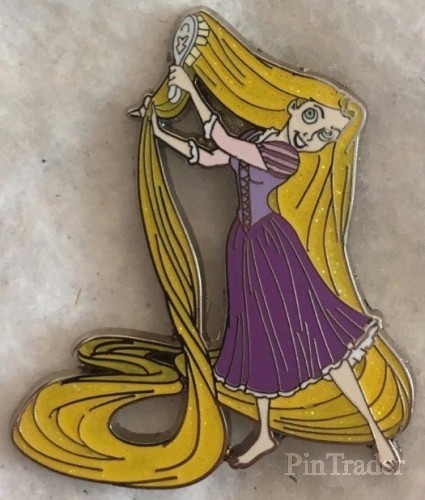 | Several pins have been released using this art. This version is on silver metal and has glitter in Rapunzel’s hair. |