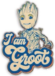 | ''I am Groot.'' What more is there to say about this simply adorable pin inspired by Marvel's Guardians of the Galaxy? Magic in the details * Screen art on metal pin * ''I am Groot'' text * Silvertone finish * Round pinbacks * Comes on Marvel card The bare necessities * Metal / enamel * 1 3/4'' H * Imported |