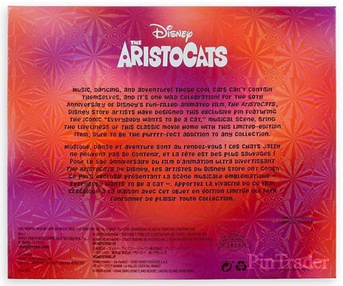 | Celebrate the 50th Anniversary of Disney's animated classic The Aristocats with this jumbo limited edition pin. Everybody wants to be a cat as Scat Cat and his boys show Marie, Toulouse, and Berlioz where the fun is at in a dimensional pin-on-pin design. Magic in the details * Limited Edition of 2,000 * Jumbo collectible pin * Includes Marie, Toulouse, Berlioz, Scat Cat, Peppo, Hit Cat, and Shun Gon in art inspired by the original 1970 movie poster * Enameled cloisonné * Pin-on-pin elements * Goldtone finish * Mickey icon pin backs * Disney Pin Trading 2020 backstamp * Boxed in a colorful window display package * Commemorates the film's 50th Anniversary * Disney's The Aristocats premiered December 11, 1970, followed by general release on December 24, 1970 The bare necessities * Metal / enamel * Pin: 5'' H x 4 3/4'' W * Box: 6 1/2'' x 5 1/4'' x 1 1/4'' * Imported |