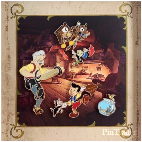 | Celebrate the 80th Anniversary of Walt Disney's animated masterpiece Pinocchio with this set of five limited edition pins. Makes no difference who you are, you'll love our handsome storybook displaying Pinocchio, Geppetto, Jiminy Cricket, Figaro, and Cleo, full of life as you will always remember them. Magic in the details * Limited Edition of 2,100 * Set of five collectible pins * Includes Pinocchio with Figaro, Geppetto, Cleo, Jiminy Cricket and Cuckoo Clocks * Enameled cloisonné * Goldtone finish * Mickey icon pin backs * Disney Pin Trading 2020 backstamp * Boxed in replica of the storybook as seen in the film, with Geppetto's Workshop backdrop inside * Commemorates the film's 80th Anniversary * Walt Disney's Pinocchio premiered on February 7, 1940 at the Center Theater in New York City, followed by general release on February 23, 1940 The bare necessities * Metal / enamel * Pins: Up to 2 3/4'' H * Box: 1 1/4'' H x 5'' W x 5'' D * Imported |