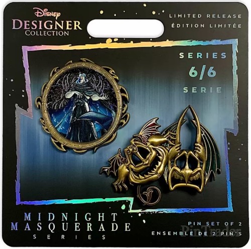 | The Disney Villains are here to crash the Midnight Masquerade with this limited release two-pin set inspired by our Disney Designer Collection Dolls. A portrait of Hades, lord of the underworld, in a dramatic costume—plus a magical sculpted mask featuring Pain and Panic—will light a fire under Disney pin collectors. Magic in the details * Limited Release * Set includes two pins: Hades portrait and matching Pain & Panic mask * Portrait: printed art with matte finish and metal sculpt frame * Mask: bas relief sculpt * Golden finish * Mickey icon pin backs * Comes on card with metallic foil elements * Number six of six sets in this Disney Villains series * Inspired by Disney's Hercules (1997) * Part of our Disney Designer Collection, Midnight Masquerade Series – Villains The bare necessities * Metal / enamel / plastic * Pins: Up to 2 1/2'' H or W * Card: 5'' x 5'' * Imported |