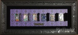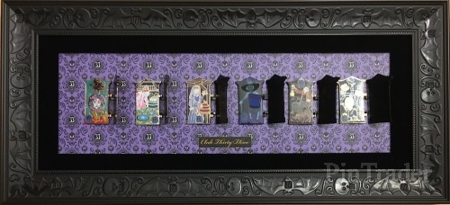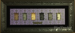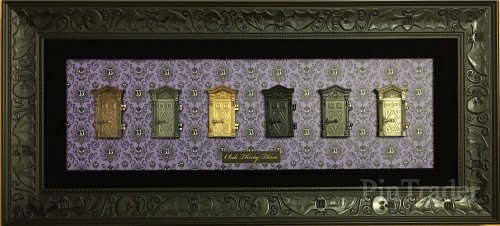 | The doors are limited edition 1000. It is unknown how many were used in framed sets. This set of pins was released by Club 33 to celebrate the 50th Anniversary of The Haunted Mansion at Disneyland Resort. Each pin was sold exclusively to Club 33 members, who could purchase up to five sets of pins. Each door is hinged with the Club 33 logo at the top and is made of a different metal. |