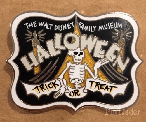 | This pin was sold at the Walt Disney Family Museum in San Francisco, Ca. It came out in the fall of 2010. This pin features a skeleton from Disney’s 1929 Silly Symphony “The Skeleton Dance.” He is against a black background with glitter filled gold curtains. Two similar glittering candles in the background to the left and right of the curtain. Above the curtain in white lettering is The Walt Disney Family Museum. Below that is the word Halloween. Directly under the skeleton figure is a white banner with black lettering and orange outline that says Trick or Treat. There is a white border following the shape of the Pin. A thinner inner and outer silver border follows the shape of the pin as well. The back pattern on the pin is a grid pattern like small squares. A box reads has the copy right “c” symbol 2009 date. Below that The Walt Disney Family Museum, LLC. Below that the copy right “c” symbol Disney. Below that China. |