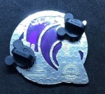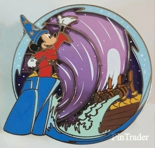| This variation features purple waves (background) with Sorcerer Mickey standing on a rock in his red cloak and blue sorcerer hat. Three pins per box. |