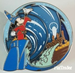 | This variation features dark blue waves (background) with Sorcerer Mickey standing on a rock in his red cloak and blue sorcerer hat. Three pins per box. |