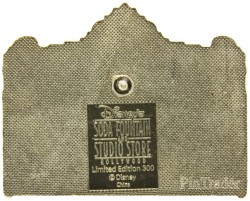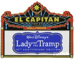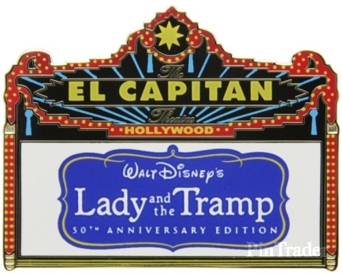 | This pin commemorates the 50th anniversary showing of the newly digitally restored screening of The Lady and the Tramp at the El Capitan theatre on February 2nd, 2006. Pin says "Walt Disney's Lady and the Tramp 50th Anniversary Edition" on the familiar El Capitan Marquee style pin. Pin is gold metal, with a dots or pits pattern on the back. Standard DSF backstamp: Disney's Soda Fountain and Studio Store Hollywood Limited Edition 300 (C) Disney China Generic DSF backing card. |