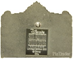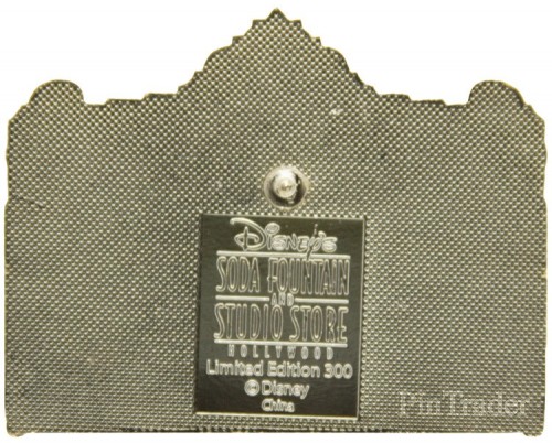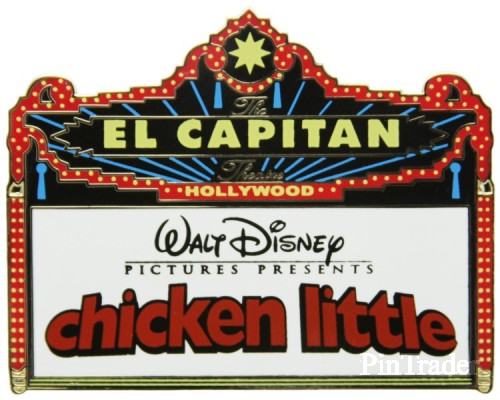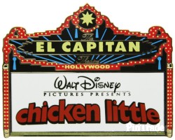 | Released at Disney's Soda Fountain and Studio Store in Hollywood, Ca for the theatrical release of Chicken Little. Pin says "Walt Disney Pictures Presents Chicken Little" on the familiar El Capitan Marquee style pin. Pin is gold metal, with a dots or pits pattern on the back. Standard DSF backstamp: Disney's Soda Fountain and Studio Store Hollywood Limited Edition 300 (C) Disney China Generic DSF backing card. |
