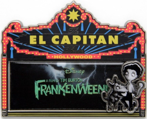 | Victor and Sparky play catch on this limited edition marquee pin released at the Disney Soda Fountain for the movie's opening. * This pin resembles the El Capitan Marquee. * The movie title is illuminated in green against a black and white moonlit night. * The movie title is a photo-printed enamel-coated element. * Victor and Sparky are pin-on-pin. * Silver finished * Ice-cream cone-patterned back * DSF logo backstamp |
