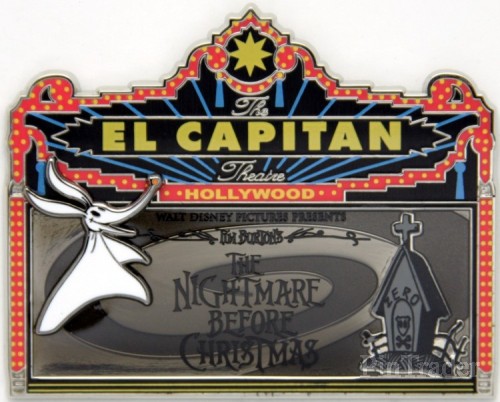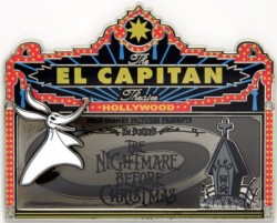| Released at Disney's Soda Fountain and Studio Store in Hollywood, Ca for the limited engagement of Tim Burton's The Nightmare Before Christmas (NBC, NMBC) at the El Capitan Theater in October, 2012. Pin reads "Walt Disney Pictures Presents Tim Burton's The Nightmare Before Christmas" with Jack's dog Zero and his dog house. This is the 9th in an ongoing series of Nightmare Before Christmas marquee pins released for the annual Halloween showings of the film at the El Capitan. |