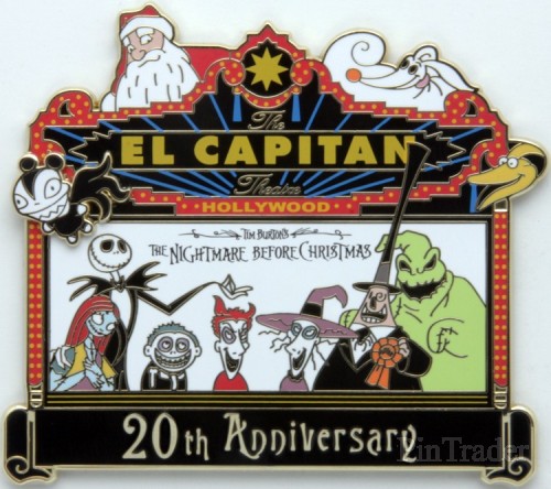 | Released at Disney's Soda Fountain and Studio Store in Hollywood, Ca for the limited engagement of Tim Burton's The Nightmare Before Christmas at the El Capitan Theater in October, 2013. Pin reads "Walt Disney Pictures Presents Tim Burton's The Nightmare Before Christmas" and "20th Anniversary" in a banner at the bottom. Characters featured: Jack Skellington, Sally, Lock, Shock, Barrel, Mayor, Oogie Boogie, Santa (Sandy Claws), Zero, Scary Teddy and the Giant Snake. This is the 11th in an ongoing series of Nightmare Before Christmas marquee pins released for the annual Halloween showings of the film at the El Capitan. |