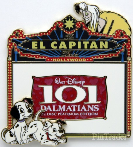 | Released at Disney's Soda Fountain and Studio Store in Hollywood, Ca for the theatrical re-release (and DVD release) of Walt Disney's 101 Dalmatians. Pin features Cruella De Vil and two of the Dalmatian puppies. |