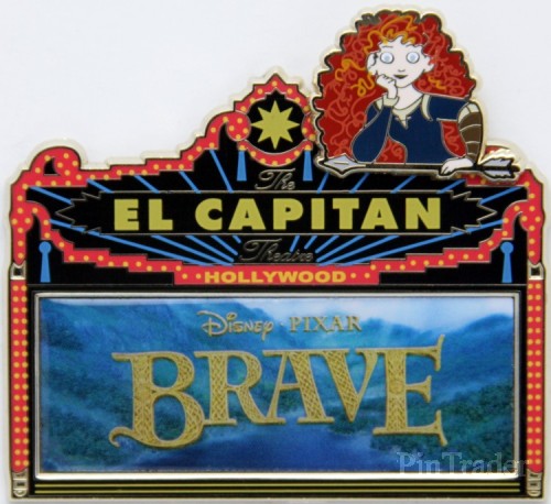 | Released at Disney's Soda Fountain and Studio Store in Hollywood, Ca for the theatrical release of Disney/Pixar's Brave. Pin features Merida looking over the top of the marquee. |