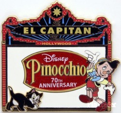 | Released at Disney's Soda Fountain and Studio Store in Hollywood, Ca for the theatrical re-release of Walt Disney's Pinocchio for it's 70th Anniversary. Pin features Figaro and Pinocchio. |