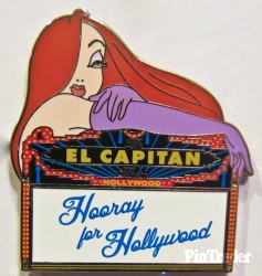 | This open edition pin from the Disney Studio Store in Hollywood at the Ghiradelli Soda Fountain features Jessica Rabbit. The El Capitan Marquee says "Hooray for Hollywood". On top of the Marquee is Jessica's head, arm and shoulders. One arm is resting on top of the marquee with the other hand coming over the top. |