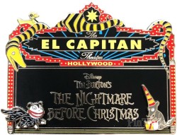 | 16th Nightmare Before Christmas marquee DSSH's annual NMBC marquee pin features Snake, Duck Toy, Scary Teddy and Rat with party hat around the marquee. Rat is holding a Christmas present, and Snake has eaten one. Teddy and Rat are pin-on-pin elements. |