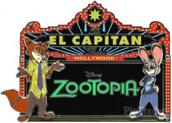 | This pin commemorates the release of the Disney movie Zootopia at the El Capitan Theatre in Hollywood, California. On the black marquee is the movie's logo in green, "Disney's Zootopia." Nick Wilde and Judy Hopps are featured on the marquee. |