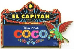 | Disney Studio Store Hollywood pin release on October 11, 2019 features 5 pins from the Pixar movie Coco. This pin is a Coco marquee featuring Pepita, an Alebrije who is a spirit guide for Imelda Rivera. |