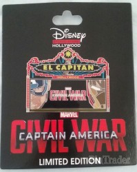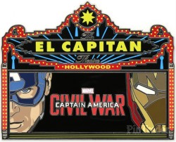 | This pin commemorates the release of the Marvel movie Captain America Civil War at the El Capitan Theatre in Hollywood, California. The black marquee features Captain America on one side and Iron Man on the other side. |
