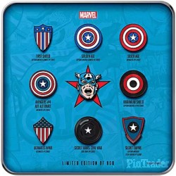 * Set of nine pins depicting Captain America's shields from the Golden Age to Secret Empire, plus Captain America himself!
