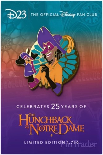 | Come one, come all! Everything is upsy-daisy as D23 celebrates 25 years of Disney's The Hunchback of Notre Dame. In his topsy-turvy best, Clopin rings-in this animated milestone with a colorful D23 Gold Member-exclusive pin. Magic in the details * Created exclusively for D23 Gold and Gold Family Members * Limited Edition of 1,750 * Exclusive to D23 Gold Members * Features Clopin set against the dramatic windows of Notre Dame * Enameled cloisonné * Official D23 backstamp * Golden finish * Mickey Mouse icon pin backs * Comes on custom-designed backer card * Commemorating 25 years of Disney's The Hunchback of Notre Dame (1996) The bare necessities * Metal / enamel * Approx. 2'' Diameter * Imported |