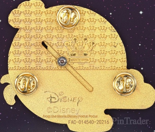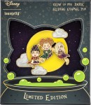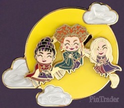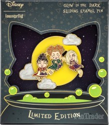 | This spooktacular pin has it all!! The moon glows in the dark, the Sanderson sisters slide, and there is pearlized enamel fill in the clouds. Please note the box has an error that reads LE 500, but it is actually LE 1,200. |