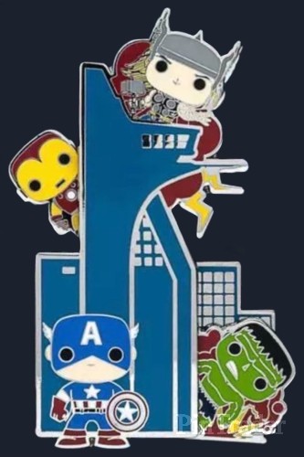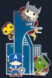 | • Features Iron Man, Thor, Hulk, and Captain America on the Avengers tower • Characters resemble their Pop! designs from Funko • Iron Man and Hulk are slidable pins • Pin-on-pin design • Silvertone finish • Comes in a box • 3" Height • Metal/Enamel |