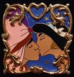 | This pin features Aladdin and Jasmine sharing a passionate kiss against a starry blue background. This kiss looks like the balcony scene from the movie. They are framed by gold filigree and hearts. WDW SKU: 10971277 DLR SKU: |