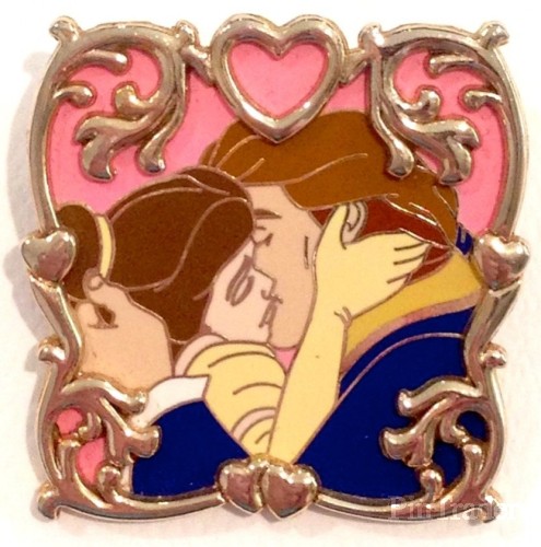 | This pin features Belle and the Beast (as a human) from Beauty and the Beast sharing a passionate kiss against a pink background. They are framed by gold filigree and hearts. WDW SKU: 10971275 DLR SKU: 8236171 TDR SKU: 0405820700923 |