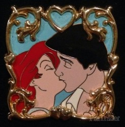 | This pin features Princess Ariel and Prince Eric from The Little Mermaid sharing a kiss against a light blue background. They are framed by gold filigree and hearts. WDW SKU: 10971275 DLR SKU: 8236171 TDR SKU: 0405820700923 |