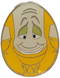 | This is one of 15 pins from the set of mystery box pins from Hong Kong Disneyland for Easter 2018. Each box contains 5 randomly selected pins. Each pin is about 1.5" high. This pin is Lumiere the Candelabrum from Beauty and the Beast. The egg is mostly yellow, in the center you see the white face of Lumiere with his big smile, on both side you can see parts of the candles. The back of the pin has one pin back at the top, a box with the Disney Pin Trading logo below it. A larger rectangle box with Hong Kong Disneyland logo with castle, and last box below it is (c) Disney. The FAC is along the left side edge. 020070-17363 Five pins per box. |