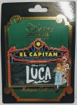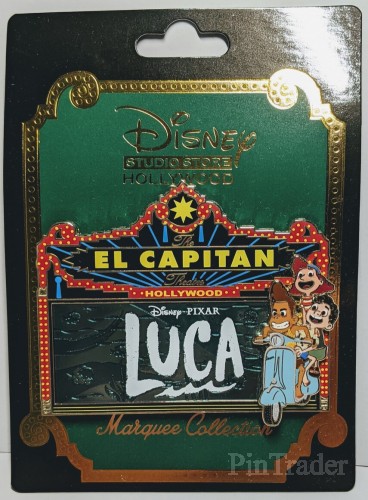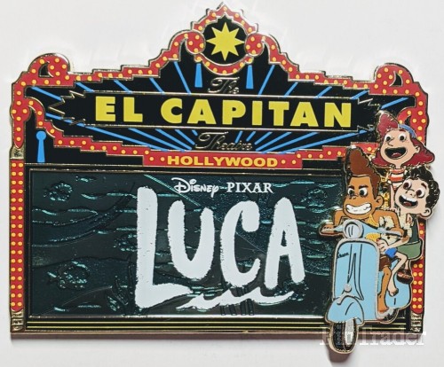 | El Capitan Marquee #223 This is the DSSH Marquee pin for the original release of Pixar's 2021 film Luca. Luca (smiling), Alberto (driving) and Giulia (smiling) ride a blue vespa (pin on pin). The logo (Disney Pixar, LUCA) appears over glitter made to look like sparkling blue ocean water. The red, blue and yellow (star/lights) marquee top of the pin reads "The El Capitan, Hollywood" DSSH ice cream waffle pattern Sold on standard DSSH card Metal / enamel |
