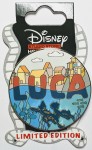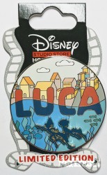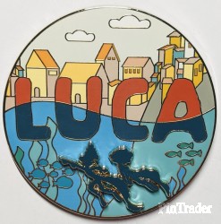 | This round (circle) logo pin for Pixar's 2021 film Luca, features the logo for the movie and Luca and Alberto as sea monsters (pin on pin). They swim in the blue water below the work 'LUCA' and the Italian village. You see a skyline of buildings, roofs in orange, yellow, and brown. 'LUCA' is in red and purple. There are clouds, fish and seaweed. Sold by DSSH only in the 'Luca at Home Premiere Pack' which contained this pin, cookies, candies, Funko Pop!, plush and consessions at home lanyard/movie credentials.) Limited Edition of 200 DSSH ice cream waffle pattern Sold on standard DSSH card Metal / enamel Just under 2" in diameter |