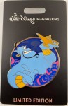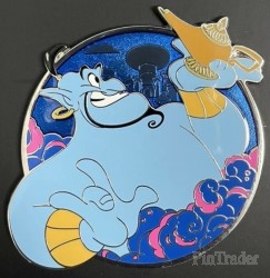 | Genie from Aladdin holds his magic lamp in front of a glossy blue background with Agrabah etched into the background. Pink and blue smoke swirls around the bottom of the pin. WDI - Mickey's of Glendale release. |