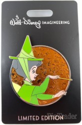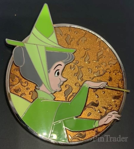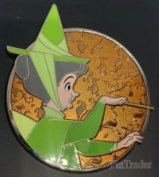| Fauna, the green fairy, from Sleeping Beauty holds her magic wand in front of a glossy orange background with leaves and briars etched into the background. WDI - Mickey's of Glendale release. |