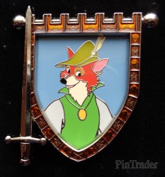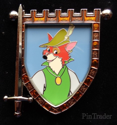 | This pin features Robin Hood. A sword is at the left of the pin and the banner (tapestry) at the right depicts Robin Hood, wearing his wedding outfit. Robin Hood is set back on the pin with the brown and gold banner around and above him and the sword on top of the banner. The brown and gold are clear and shiny with diamonds and fleur de lys under them. |
