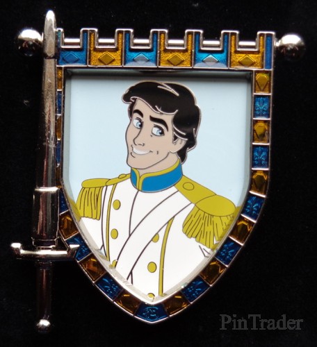 | This pin features Prince Eric from Walt Disney's "The Little Mermaid." A sword is at the left of the pin and the banner (tapestry) at the right depicts Prince Eric wearing his white uniform with gold epaulettes. Prince Eric is set back on the pin with the blue and gold banner around and above him and the sword on top of the banner. The blue and gold are clear and shiny with diamonds and fleur de lys under them. |