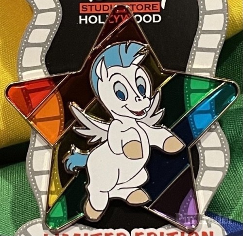 | This pin-on-pin features Baby Pegasus from Walt Disney's "Hercules." He standing on its hind legs against a rainbow-striped, stained glass background. The pin has the shape of a five-pointed star. This pin is featured in the El Capitan At Home Pride Pack #1, along with the following items: • 1 - LE 400 Mickey Mouse Rainbow Pr • 1 - Mickey Mouse Rainbow Journal • 1 - Mickey Mouse Rainbow Headband • 1 - Disney Rainbow Tumbler • 1 - 2oz Unicorn Popcornopolis® Mini Cones This pin was released as part of a pack of pins and other assorted goods on June 1, 2021, online through Disney Studio Store Hollywood, formerly Disney Soda Fountain & Studio Store (DSF). It sold out the same day and started being shipped within the week. Sales were limited to California residents. |