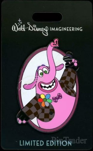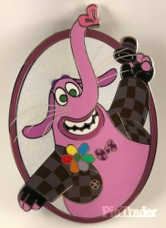 | Bing Bong the pink elephant from the movie Inside Out is on an oval shaped pin with a burgundy border. The oval is filled with shiny white fill. His trunk extends out the top of the pin. He is tipping his hat with his left hand which extends out the top left of the pin and his right hand extends out the bottom right of th pin. Available to Disney Cast Members online at Mickey's of Glendale. |