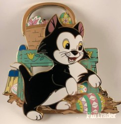 | Figaro (pin on pin) the black and white cat from Pinocchio stands on his hind paws in front of a blue painted stool. An Easter basket sits on top of the stool and a whisk broom leans on the side of the stool. There is an Easter egg on the floor beside Figaro. 2.86 x 2.75. Available to Cast Members online at Mickey's of Glendale. |