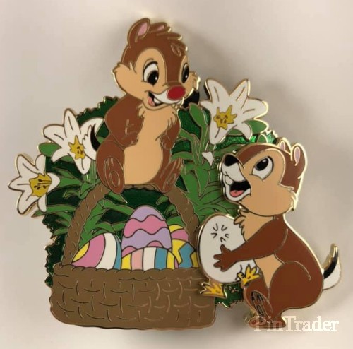 | Chip (pin on pin) holds an egg that is hatching beside an Easter Basket filled with lilies and colored eggs. Dale is sitting on the handle of the basket. 2.93 x 2.75. Available to Cast Members online at Mickey's of Glendale. |